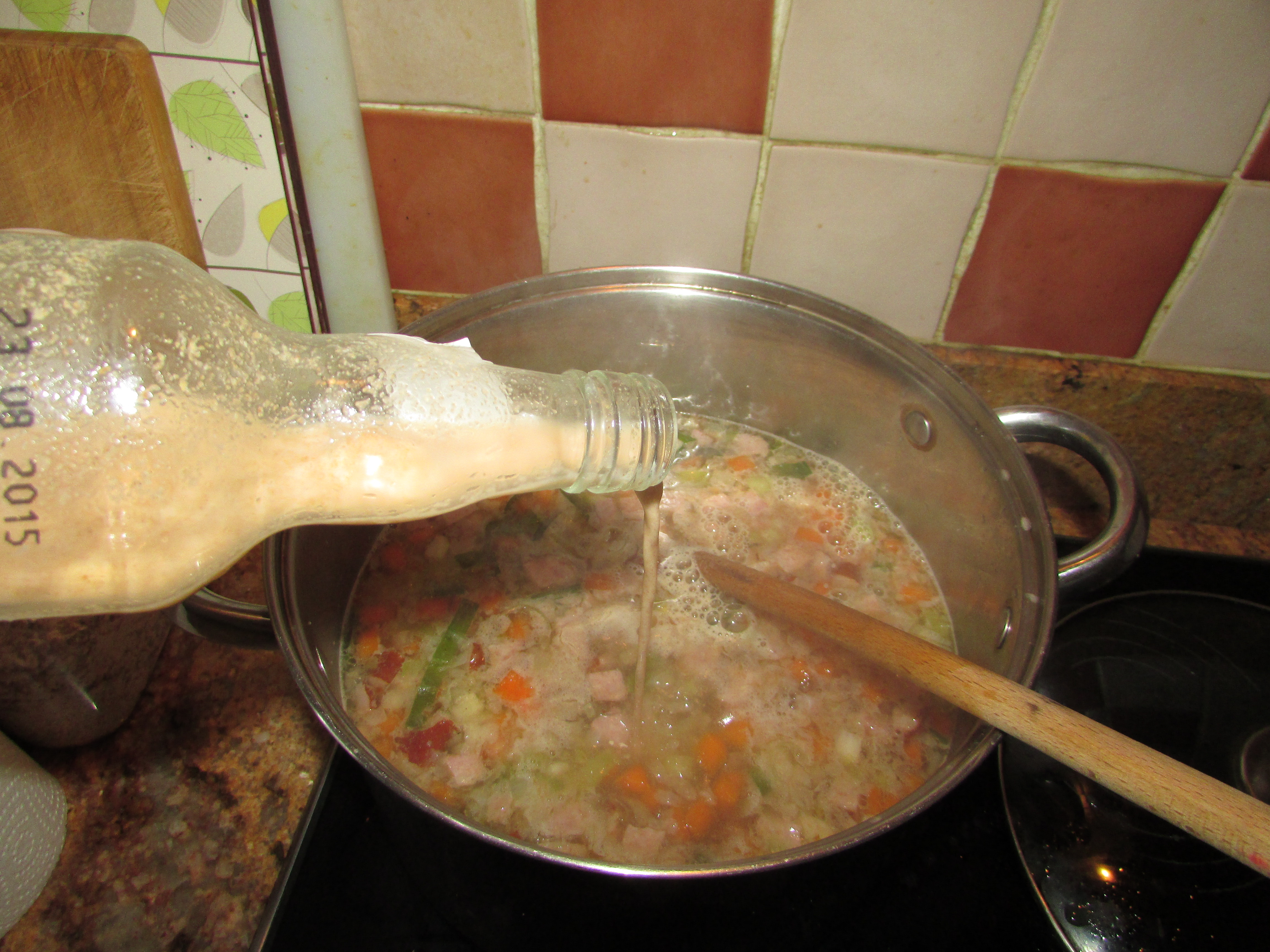 When the vegetables are soft, I take my jar/bottle with fermented flour, stir it well and pour into the soup. It must be done very, very slowly and accompanied by intensive stirring as flour tends to lump in the hot water. If you get lumps, don’t panic; they will dissolve when cooking (if not, just fish them out).